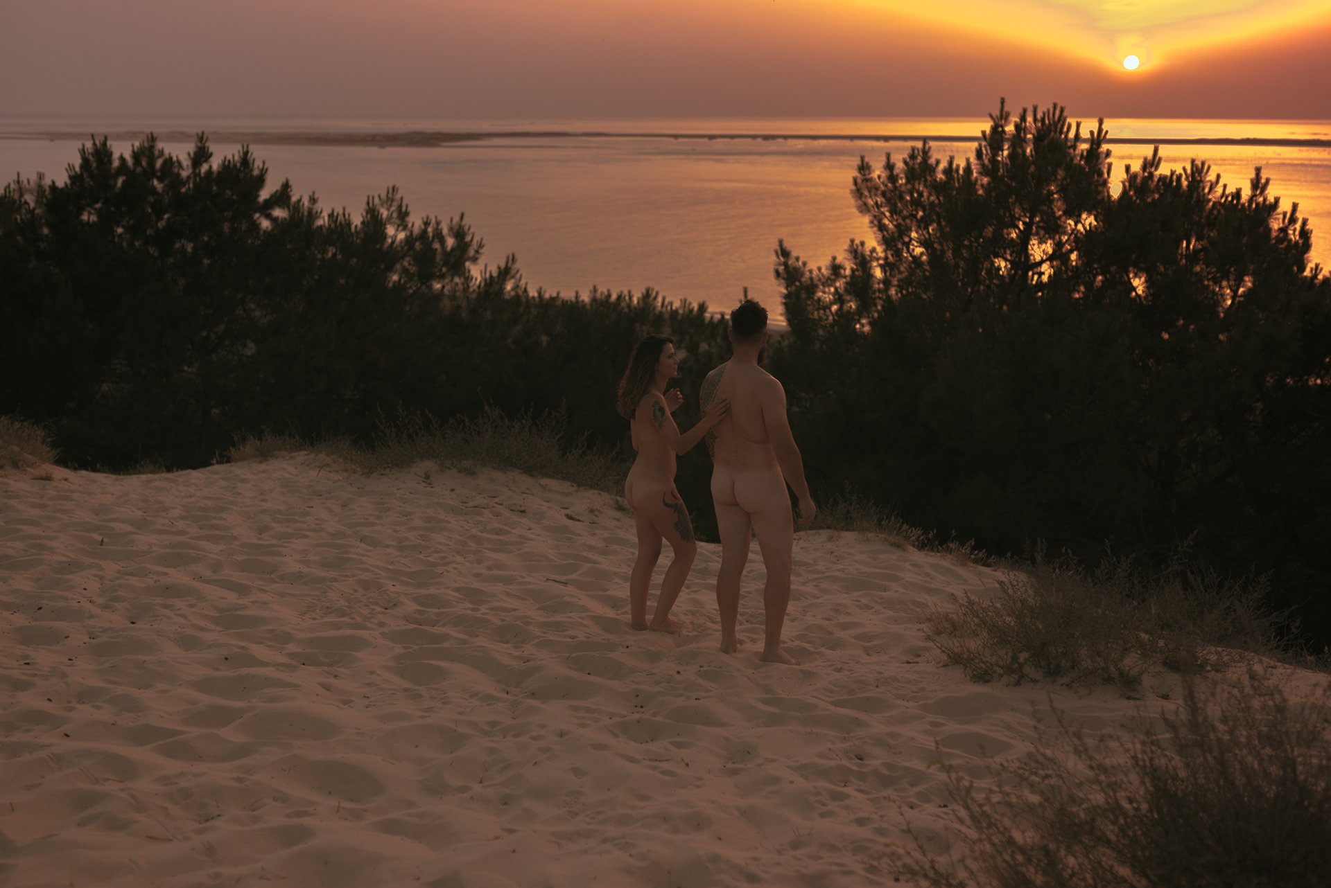 Cet été, j'ai décidé de descendre à Bordeaux pour m'aérer l'esprit, voir des proches près de Arcachon, mais aussi profiter de la nature en Gironde. C'était aussi (et surtout) l'occasion de faire de la photo et d'allier nudité et nature. Un combo que j'ai toujours trouvé puissant. Je conservais un bon relationnel avec un couple de modèles sympas sur les réseaux sociaux, Liloumoon et MaloMa (pseudonymes) qui apprécient mon univers et je leur ai proposé de faire une séance à mon arrivée à Bordeaux, ce qu'ils ont immédiatement accepté. Le projet consistait donc à photographier un couple nu dans des endroits naturels à la plage et sur large domaine de la Dune du Pilat. C'était l'occasion de sortir de ma propre zone de confort car je n'avais jamais photographié un couple hétérosexué nu, ni un homme nu, ni des modèles tatoués sur des portions importantes du corps, ni sur une plage naturiste. J'aime beaucoup faire évoluer ma vision des corps et de la nudité "amorale" de manière générale. La leçon que j'en ai tiré c'est que OUI, ma photographie et mon univers conviennent aussi aux hommes ! Mais je conserverai toujours une préférence personnelle pour les modèles féminins car je trouve que le corps est plus facile à la prise de vue. Cela prouve que je dois encore explorer ce domaine.